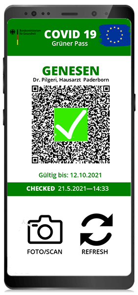Nach Ablauf der Quarantäne Schutzzeit oder Feststellung des Arztes wird durch scannen des QR-Codes auf der Arztbestätig-ung und des QR-Code des Arztes der Status genesen gesetzt. Dieser kann jederzeit beim USER abgefragt werden.